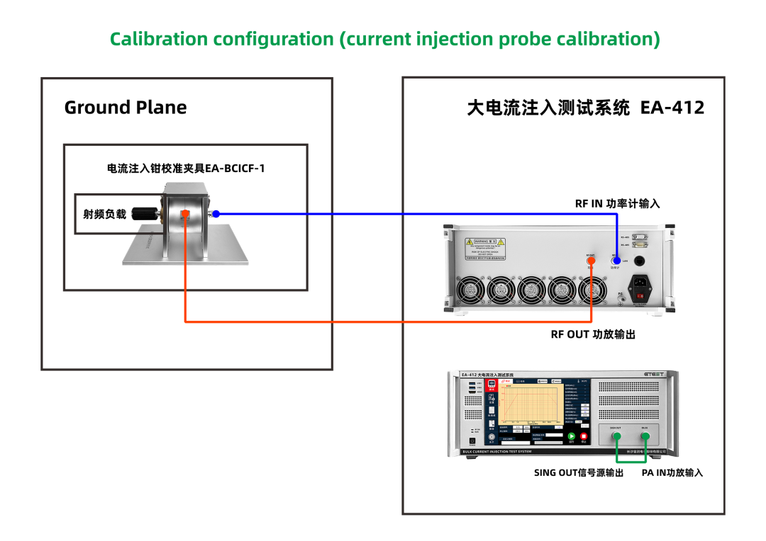 (2)将电流注入钳校准夹具 EA - BCICF - 1 放置在接地面(Ground Plane)上,夹具内的电流注入探头与射频负载相连。注入的射频信号通过电流注入探头耦合到负载上,同时利用功率计从 “RF IN 功率计输入” 端口测量反馈信号 ,根据测量值对注入电流进行调整和校准,建立起注入信号与实际注入电流之间的准确对应关系。
