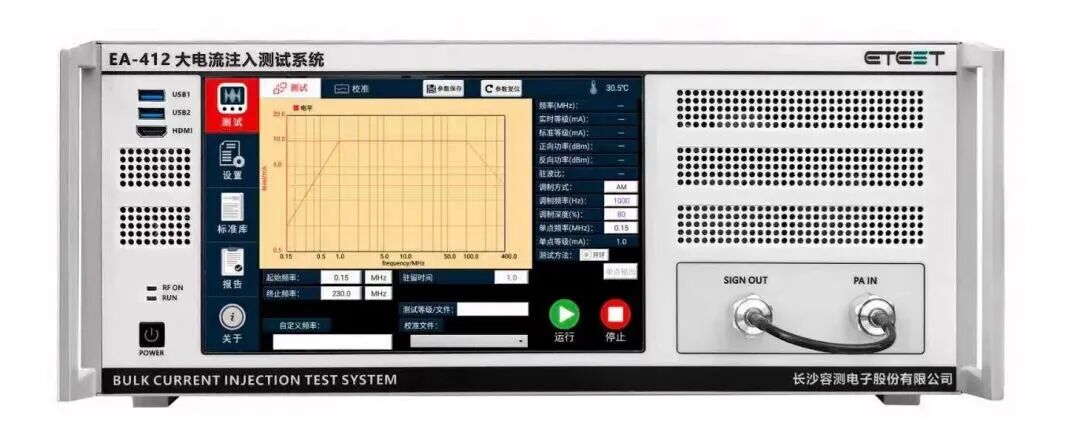 (1)利用大电流注入测试系统 EA - 412 产生已知特性的射频信号,通过 “RF OUT 功放输出” 端口输出信号。