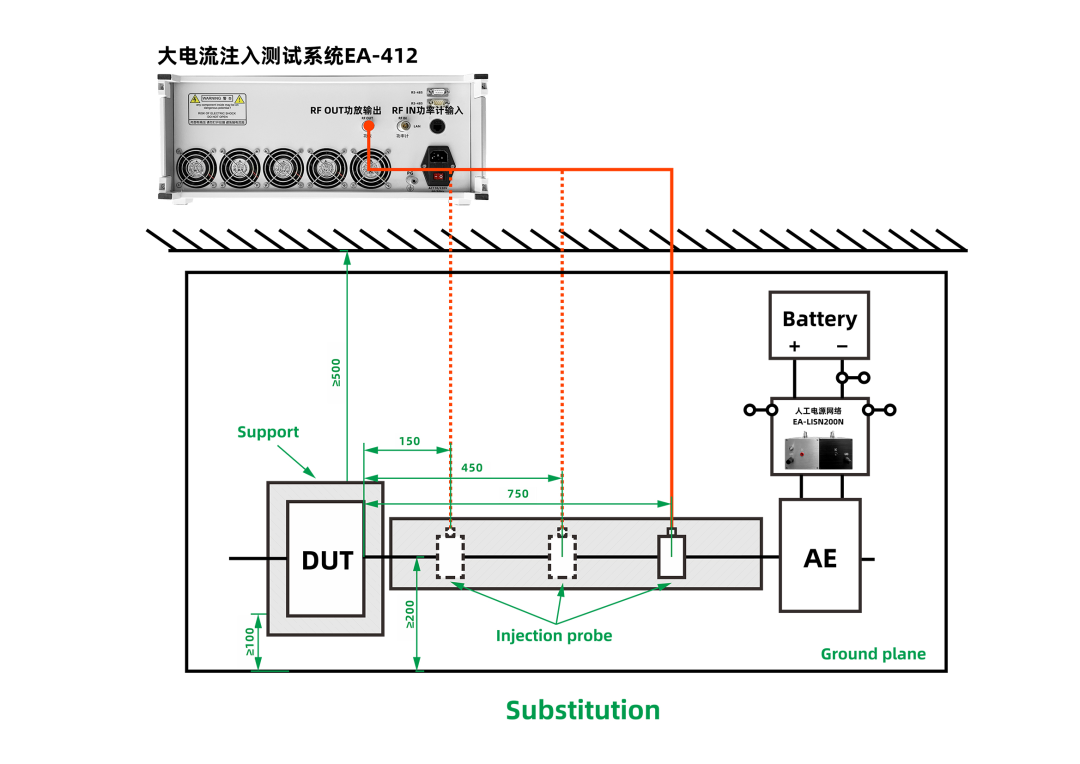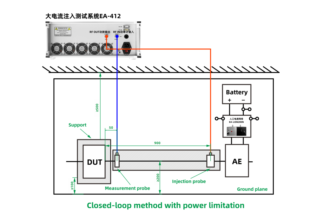 注入点距离DUT 900mm(高频段需考虑波长影响)。必须使用 电流监测探头 确保注入电流符合标准等级