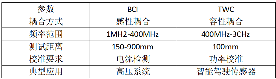 二者都适用于各类车辆(传统燃油车、电动车EV、混动车HEV)的电子电气部件线束抗扰度测试。在机动车零部件EMC抗干扰测试中,BCI和TWC各有优势,选择取决于具体测试需求和频段范围。随着TWC成为高频EMC测试重要手段,设备选型很关键。正确的测试设备和方法能提高效率、确保产品电磁兼容性、降低合规风险。
