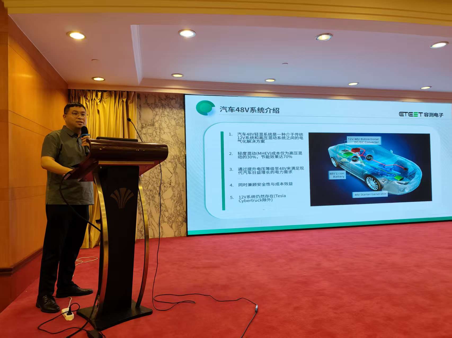 在技术交流环节中,长沙容测电子股份有限公司作为A分会委员,由我司技术工程师 卓校成 分享了 《48V及高压电性能测试解析》 专题报告,从架构背景、测试逻辑到典型工况复现进行了系统性阐述,成为本次大会技术交流环节的核心亮点之一。